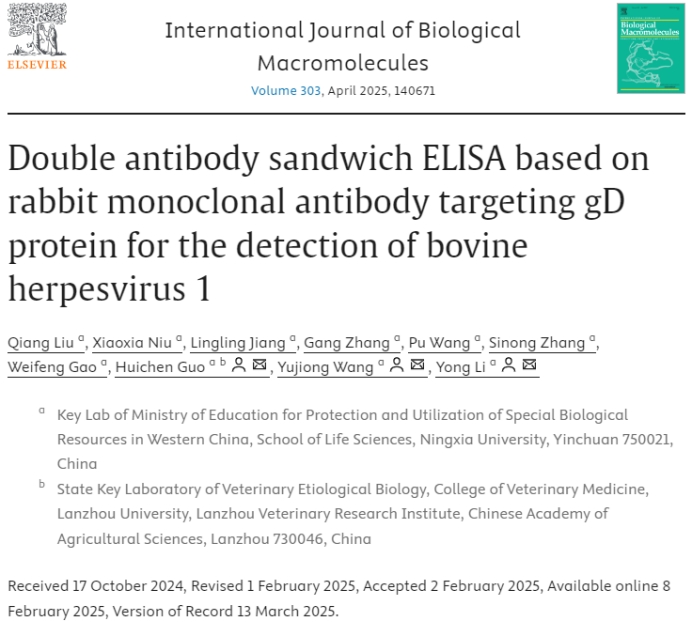 王玉炯、李勇、郭慧琛团队在中国科学院1区top期刊《International Journal of Biological Macromolecules》(2025 IF: 7.7)发表了题为“Double antibodysandwich ELISA based on rabbit monoclonal antibody targeting gD protein for thedetection of bovine herpesvirus 1”的研究论文,成功构建了一种基于兔单抗的双抗体夹心ELISA检测方法,为牛疱疹病毒1型的精准检测提供了新的工具。