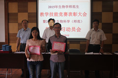 在“2015年生物学师范生教学技能竞赛”表彰会上,梁文裕副院长宣读了《2015年生物学师范生教学技能竞赛表彰决定》及获得一等奖、二等奖、三等奖的学生名单,与会领导为获奖学生颁发了获奖证书和奖品。梁文裕副院长就本次竞赛活动做了总结讲话,对圆满完成本次活动表示热烈祝贺,对参与本次活动的组织、宣传和后勤保障的师生及评审专家表示了衷心感谢。同时,希望同学们进一步加强专业知识学习和师范生从师技能的训练,为今后成为一名优秀的生物学教师打下扎实的基础。