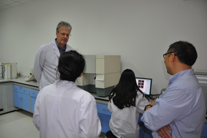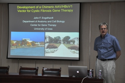 John F. Engelhardt教授访问期间,为全院师生作了题为《Development of the Chimeric AAV/HBoV1 Vector》的学术报告,与学院科研骨干进行了座谈交流,并对合作开展的科研项目进行了具体指导。