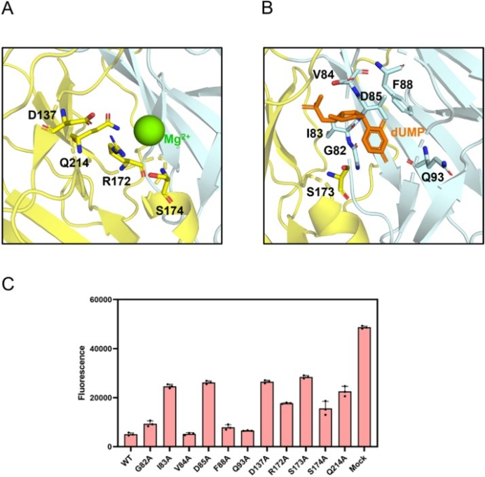 在伪狂犬病毒和其他物种的dUTPase序列比对中,发现与三聚体dUTP酶相比,PRV dUTP酶没有表现出明显的保守基序。而在伪狂犬病毒和其他疱疹病毒的dUTPase序列比对中,发现这些dUTP酶之间的序列具有6个明显保守的基序。针对这些保守基序上的结合底物的关键氨基酸进行了突变,并检测dUTPase突变体的酶活性,G82A、V84A、F88A和Q93A突变体的酶活性不受明显影响,相反,I83A、D85A、D173A、R172A、S173A、S174A和Q214A突变体的酶活性显著降低(图2)。
