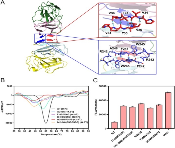 与已发现的疱疹病毒家族中单体dUTPase不同,伪狂犬病毒dUTPase以稳定的二聚体形式存在。为了探究二聚体的寡聚状态对dUTPase的作用,团队对二聚体互作界面进行分析,发现与dUTP酶的经典二聚体状态(例如克氏锥虫和重型利什曼原虫)不同,它们利用α螺旋和非二级结构之间的相互作用缠结以构成二聚体界面,而PRV dUTP酶在很大程度上依赖于在四个β折叠片的N端残基P33-V36和C端残基R242-A248之间建立的氢键和疏水相互作用网络。破坏这些残基之间的氢键网络,对酶活性产生了很大影响,热迁移试验(TSA)还表明二聚体互作界面对蛋白稳定发挥了关键作用(图3)。