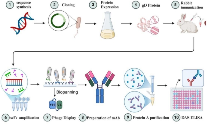 该研究以牛疱疹病毒1型的gD蛋白为靶点,构建了一个容量为7.14×10¹⁰cfu/mL的兔源单链片段变量(scFv)噬菌体展示库。通过三轮生物淘选,获得了三种高亲和力的scFv,并利用CHO-K1细胞表达出三种高亲和力的兔单克隆抗体。基于D3为捕获抗体、D2为检测抗体,成功建立了双抗体夹心ELISA方法。实验结果显示,在3% BSA封闭、抗原孵育90分钟、显色15分钟的条件下,该方法对牛疱疹病毒1型具有良好的特异性和稳定性,与其它牛相关病毒无交叉反应。同时,该方法的批内和批间变异系数均低于5%,具有良好的稳定性和可靠性。
