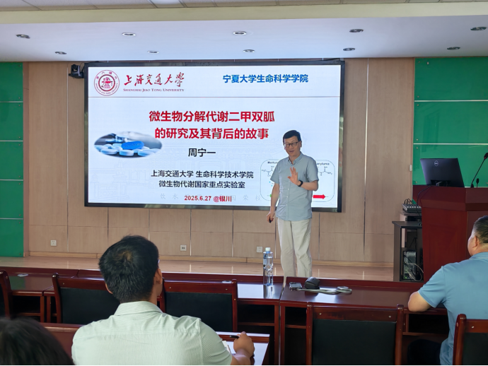 6月27日下午,上海交通大学生命科学技术学院微生物科学系主任周宁一教授、微生物代谢全国重点实验室副主任白林泉教授应邀为学院师生作专题报告,报告会由生命与食品学部副部长徐金瑞主持。