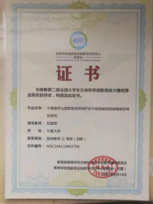 团队成员指导学生积极参与保护生物多样性的相关研究,并多次获得奖励,郑国琦指导学生作品“宁夏南华山国家级自然保护区中段阴坡和阳坡植被多样性研究”获第二届全国大学生生命科学创新大赛优秀成果奖指导教师三等奖(创新类2019)。