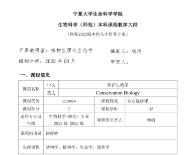 1、编写修订了基于OBE理念及课程思政目标的《保护生物学》课程教学大纲,已纳入2022版里番