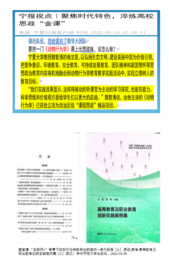 《动物行为学》教学团队获“2023 年全区大中小学校思想政治工作质量提升工程项目: 区级课程思政教学名师和团队”荣誉称号(宁教工委〔2023〕2 号,2023 年 2 月 15 日)。